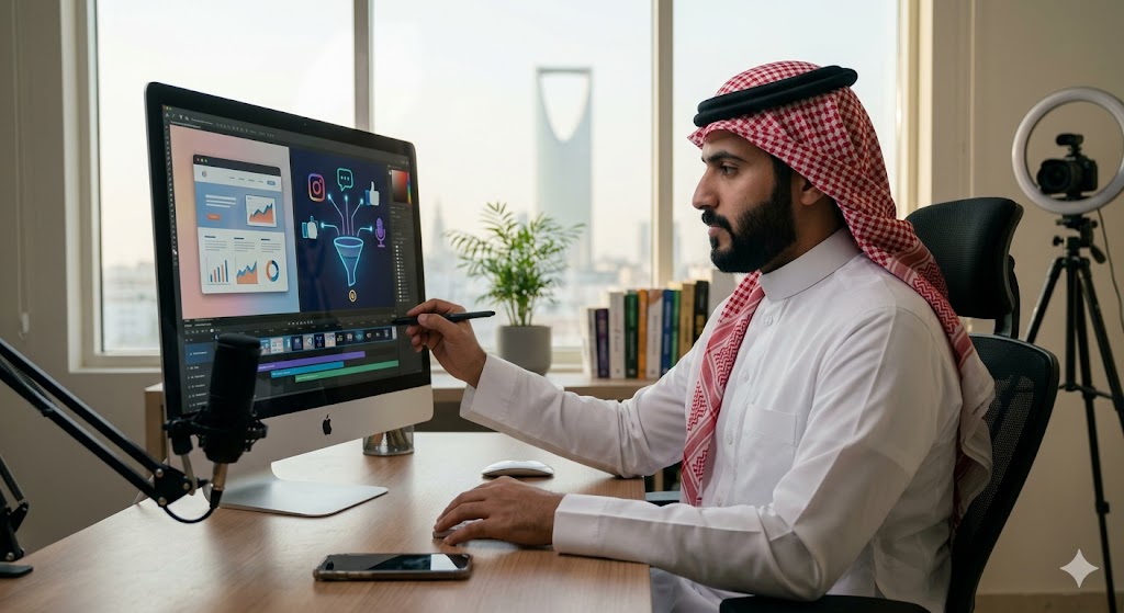 • صناعة المحتوى الإبداعي: إنتاج محتوى مرئي ومسموع (On Camera) يخاطب الجمهور المستهدف بذكاء.